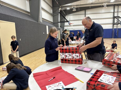 The November community service initiative focused on gathering new items, including lip balm, cozy blankets, travel mugs, hot drink packets, Christmas candy and socks. Students brought the purchased items to school for a week and the following week, the entire school came together in family groups to assemble and wrap the gift packages.