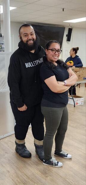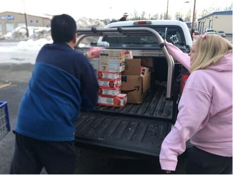 A team of volunteers picks up supplies from the main office at the Food Bank of Alaska and delivers them to the church on Wednesdays. Additional volunteers carry the supplies downstairs for storage and sorting.