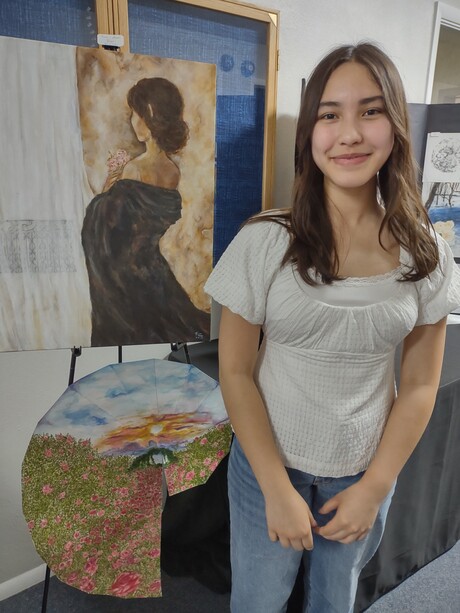 Grace Mirra smiles and showcases her piece, “Passion’s Summer Breeze.”